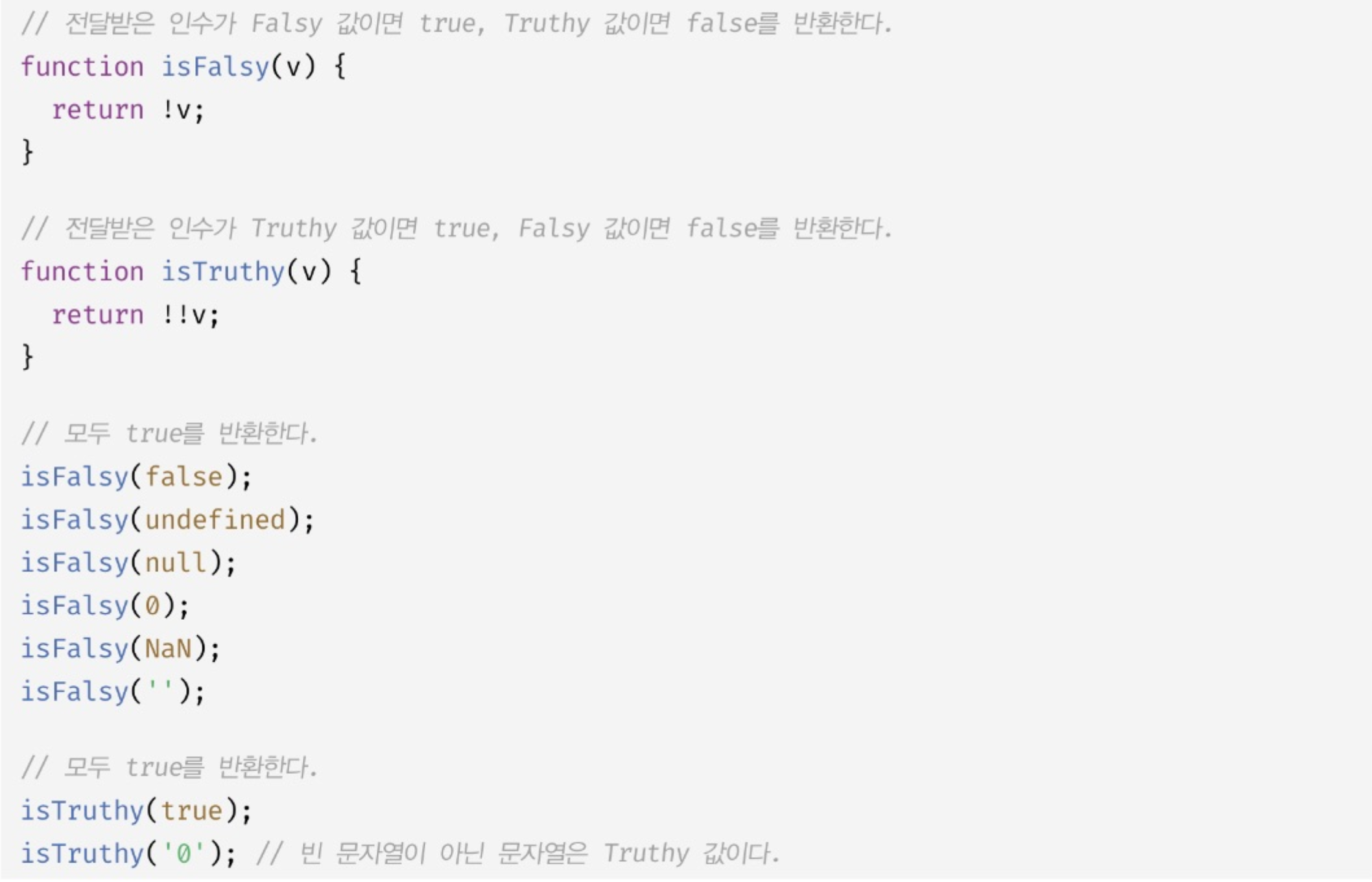 ์์ Falsy๊ฐ ์ด์ธ์ ๋ชจ๋ ๊ฐ์ ๋ชจ๋ true๋ก ํ๊ฐ๋๋ Truthy๊ฐ์ด ๋๋ค.