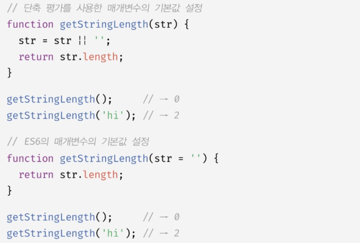 ๋จ์ถ ํ๊ฐ๋ฅผ ์ฌ์ฉํด์ ๋งค๊ฐ๋ณ์์ ๊ธฐ๋ณธ๊ฐ์ ์ค์ ํ๋ฉด undefined๋ก ์ธํด ๋ฐ์ํ ์ ์๋ ์๋ฌ๋ฅผ ๋ฐฉ์งํ๋ค.
