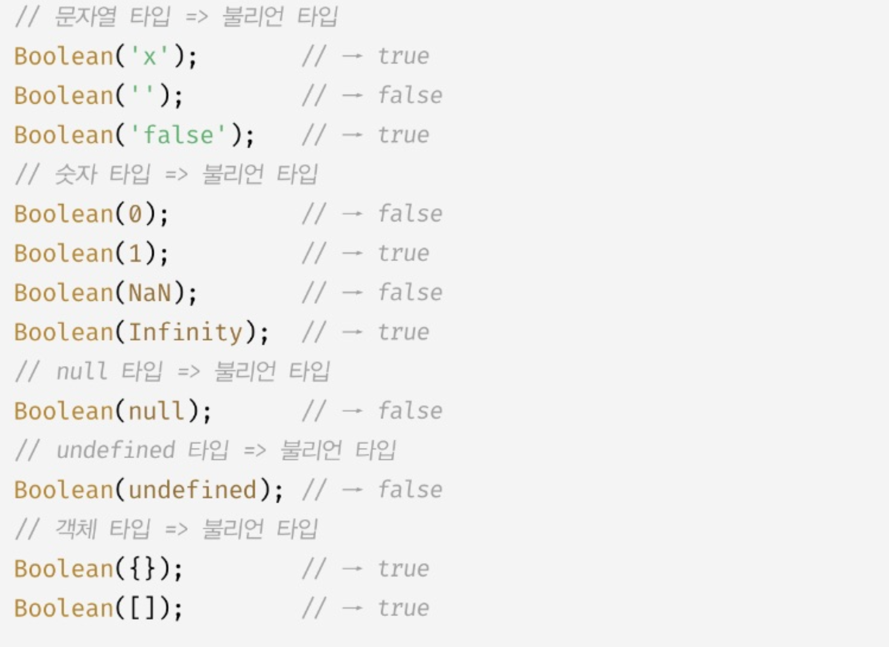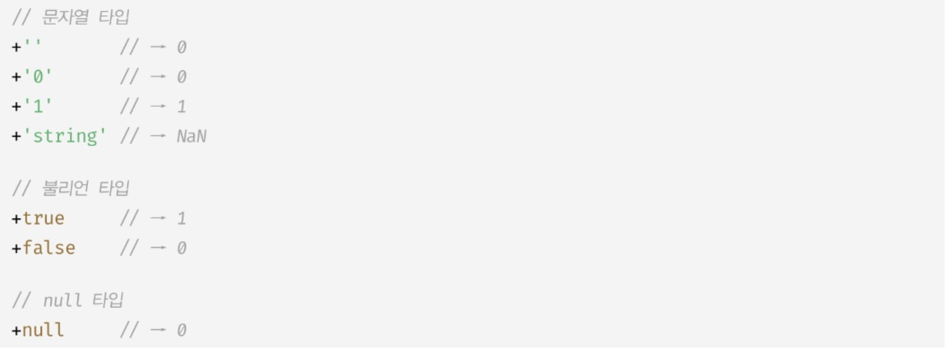 ๋น ๋ฌธ์์ด, ๋น ๋ฐฐ์ด, null, false๋ 0์ผ๋ก true๋ 1๋ก ๋ณํ๋๋ค.