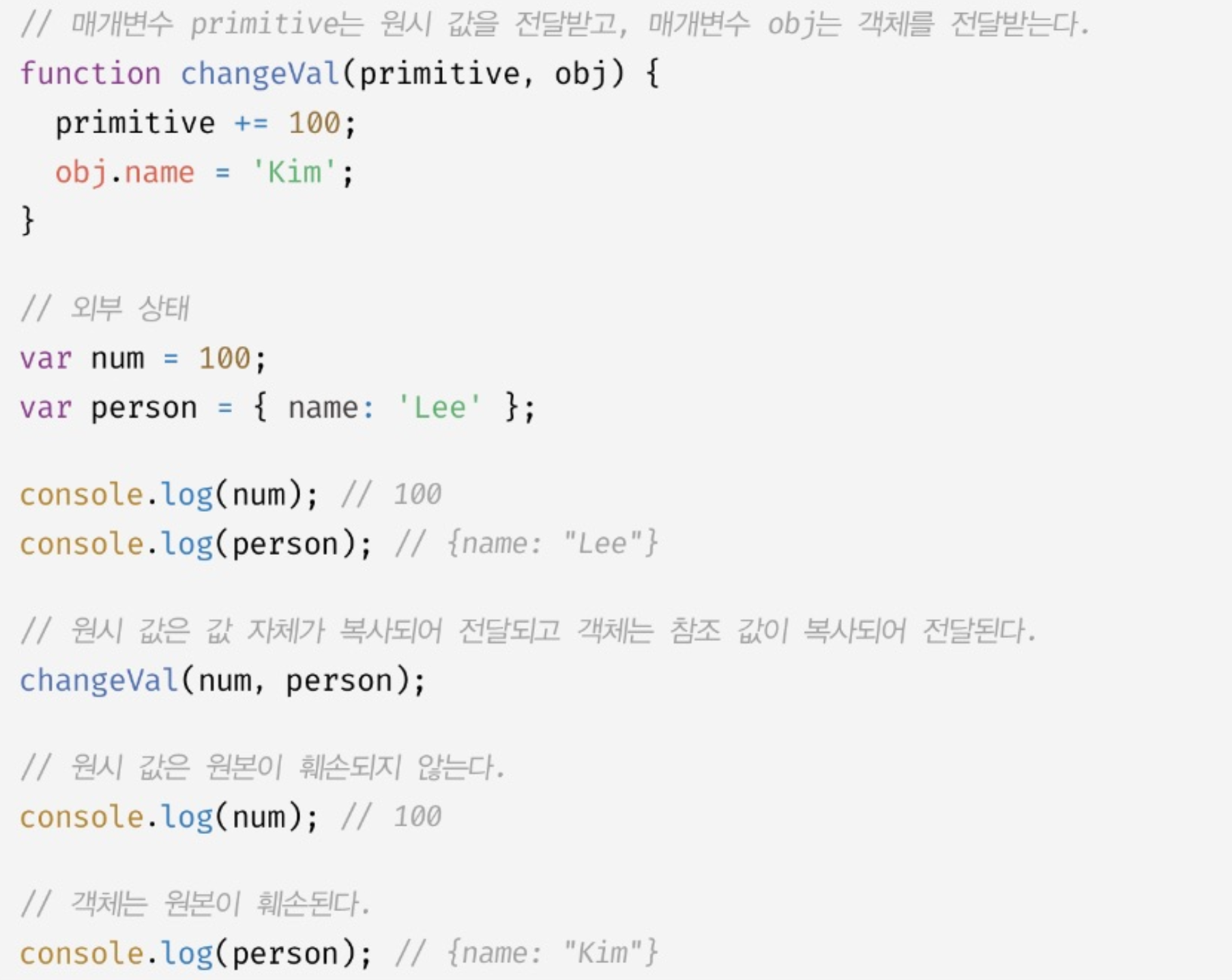 2. changeVal ํจ์๋ ๋งค๊ฐ๋ณ์๋ฅผ ํตํด ์ ๋ฌ๋ฐ์ ์์ ํ์ ์ธ์์ ๊ฐ์ฒด ํ์ ์ธ์๋ฅผ ํจ์ ๋ชธ์ฒด์์ ๋ณ๊ฒฝํ๋ค.