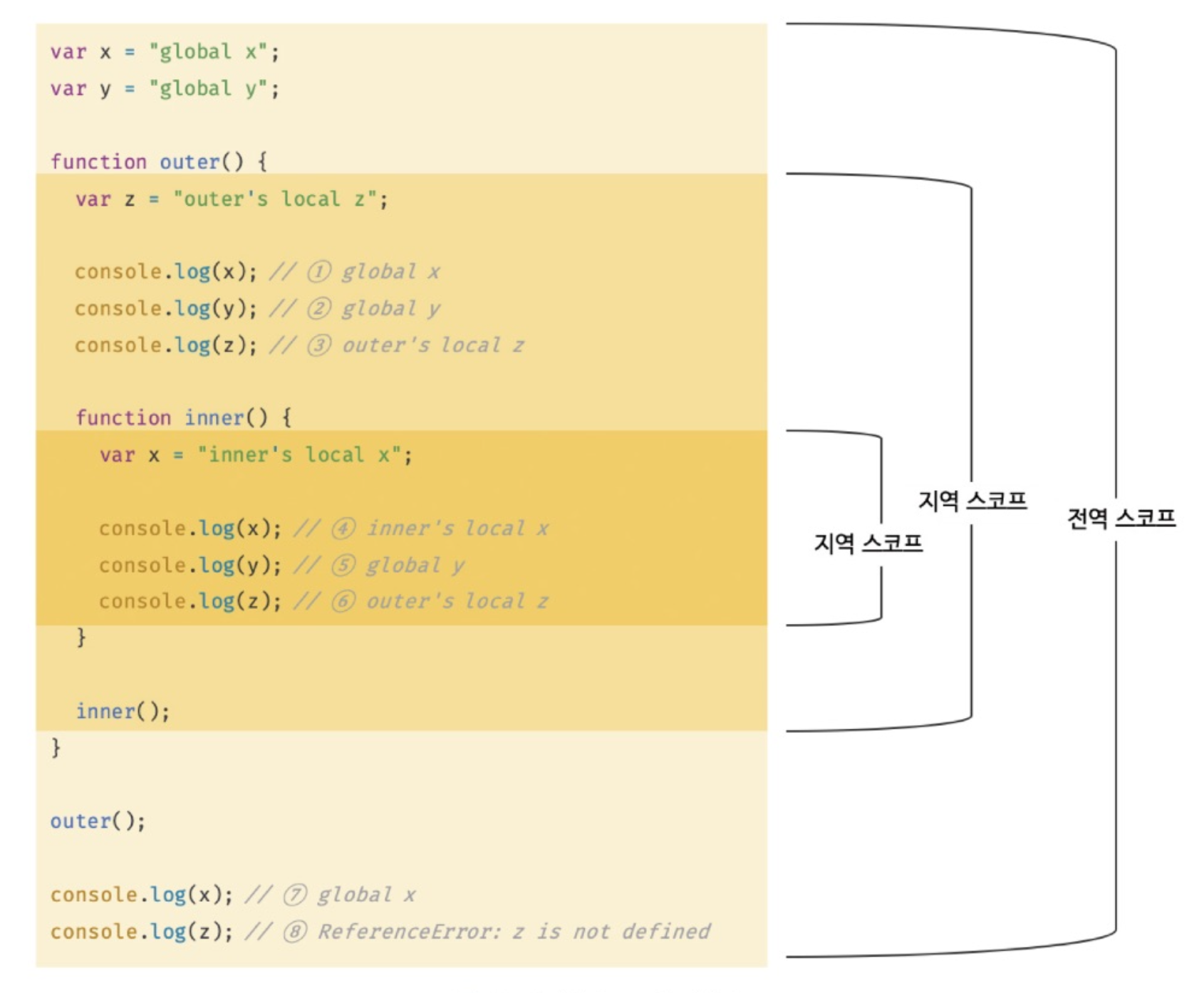 5. ๋ณ์๋ฅผ ์ฐธ์กฐํ ๋ JS์์ง์ ์ค์ฝํ ์ฒด์ธ์ ํตํด ๋ณ์๋ฅผ ์ฐธ์กฐํ๋ ์ฝ๋์ ์ค์ฝํ์์ ์์ํด